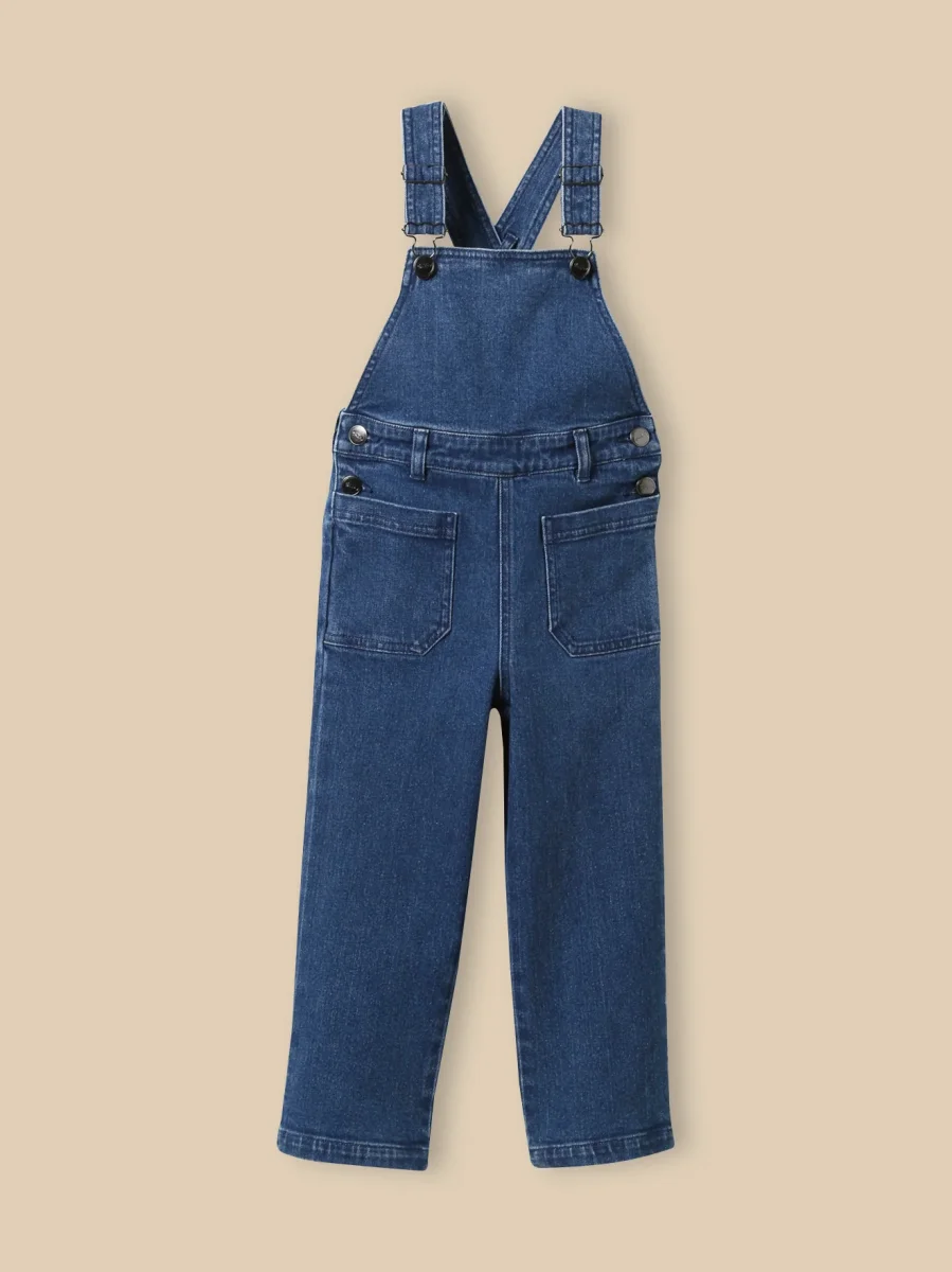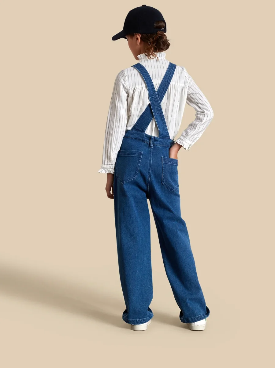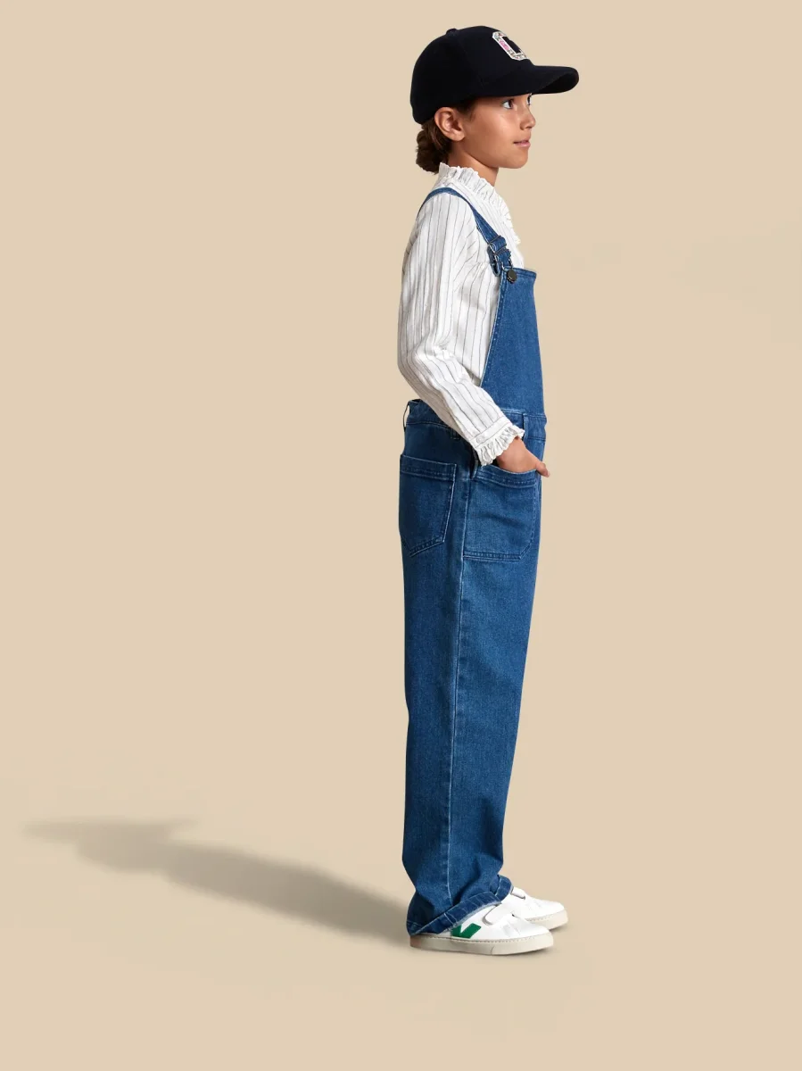 Nouvelle coupe : jambes élargies, grandes poches plaquées, bretelles croisées et toile épaisse. Une coupe loose à porter avec une blouse en tissu Liberty ou un T-shirt ajusté.