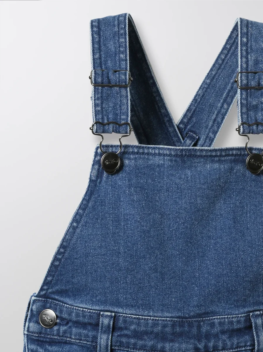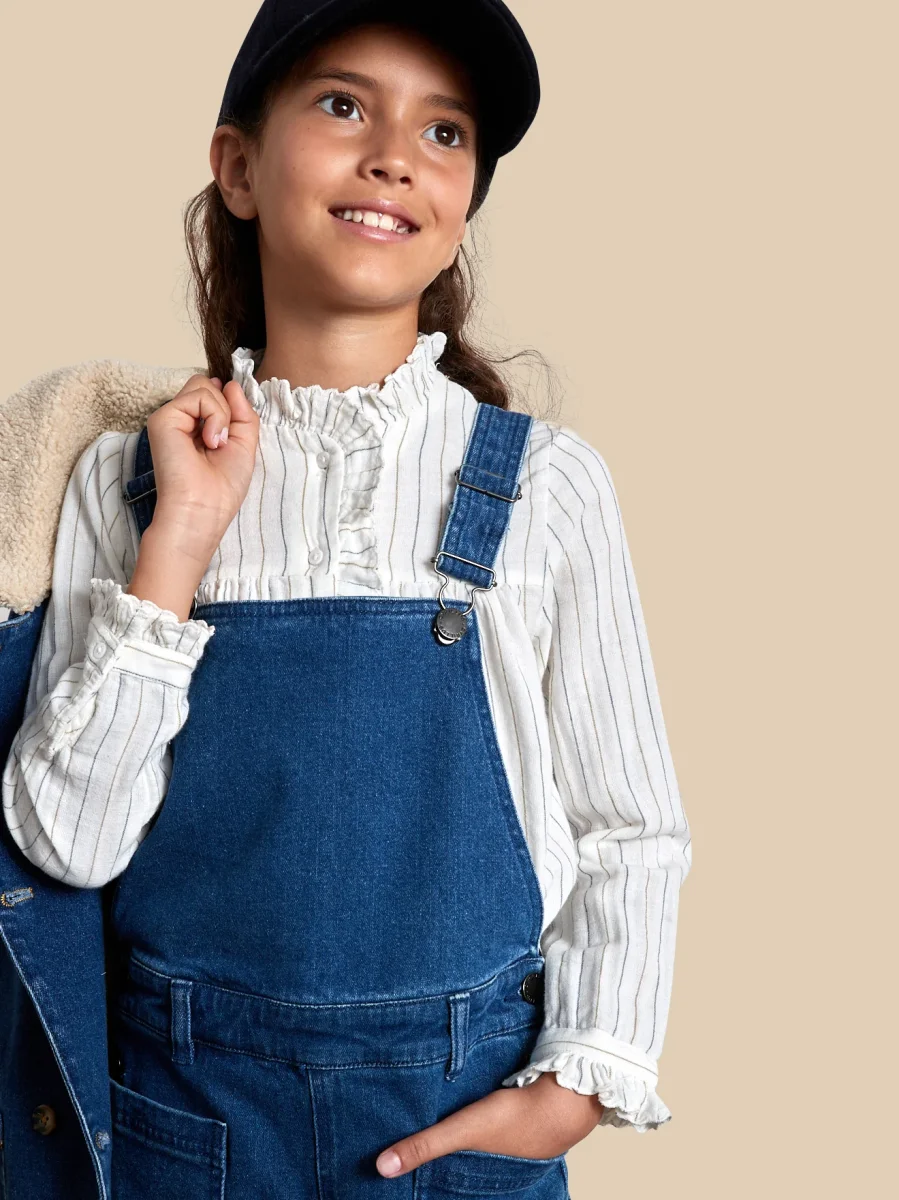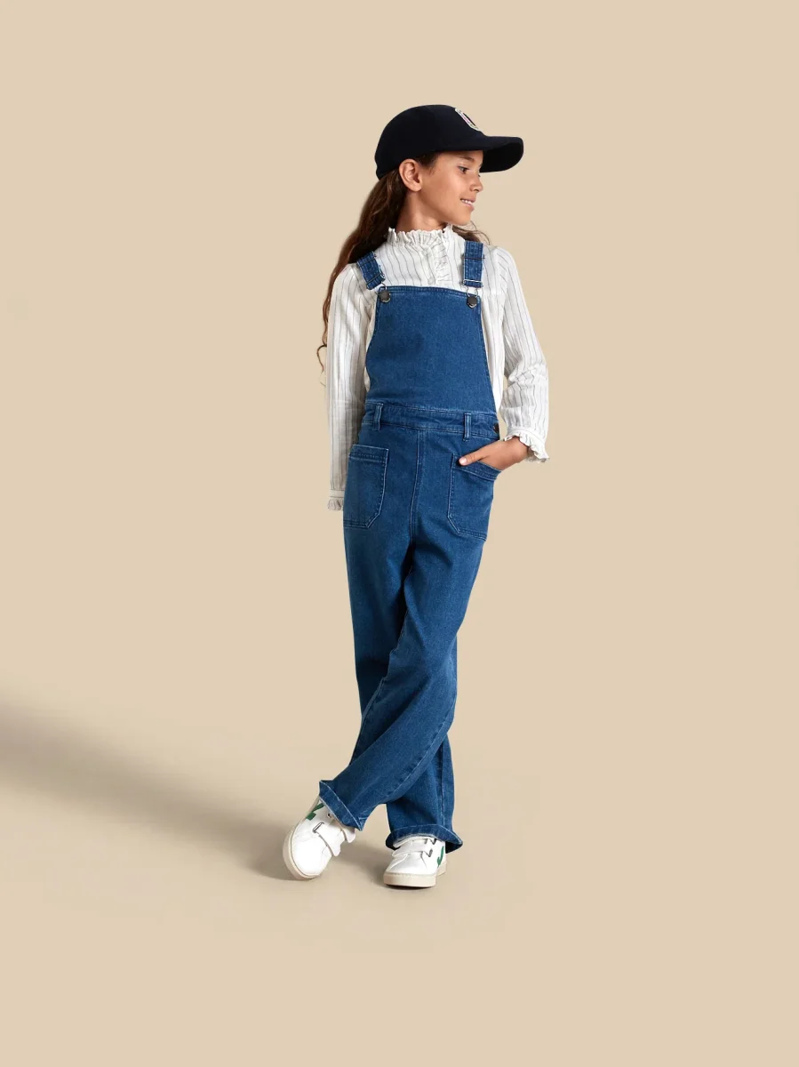 Nouvelle coupe : jambes élargies, grandes poches plaquées, bretelles croisées et toile épaisse. Une coupe loose à porter avec une blouse en tissu Liberty ou un T-shirt ajusté.