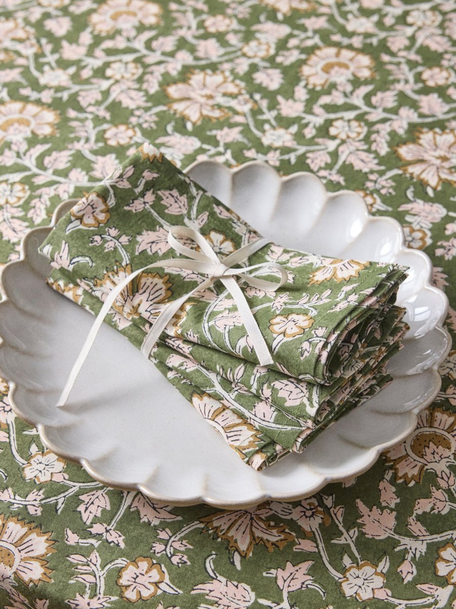 Lot de 4 serviettes de table en pur coton imprimé – Anika (fond vert) ou Amali (fond crème). Des motifs authentiques et raffinés, réalisés à la main en Inde. Pour la conception de ces serviettes, nous avons choisi l’Inde pour son talent créatif, ses techniques artisanales et son style unique. Une culture ancestrale aux savoir-faire spécifiques qui imprègnent un grand nombre de nos modèles.