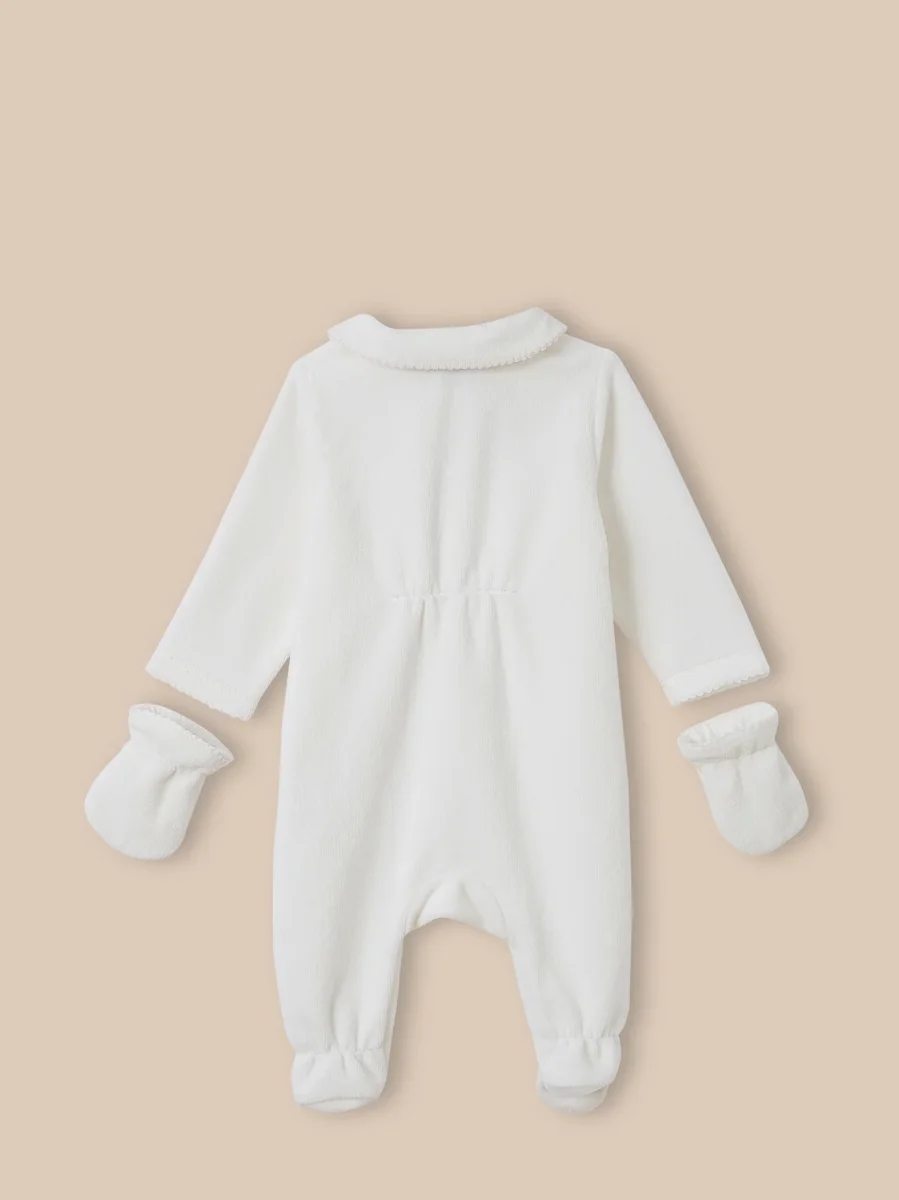 Le set spécial maternité : un dors-bien en velours tout doux, des moufles, et son bonnet assorti : le parfait cadeau de naissance !