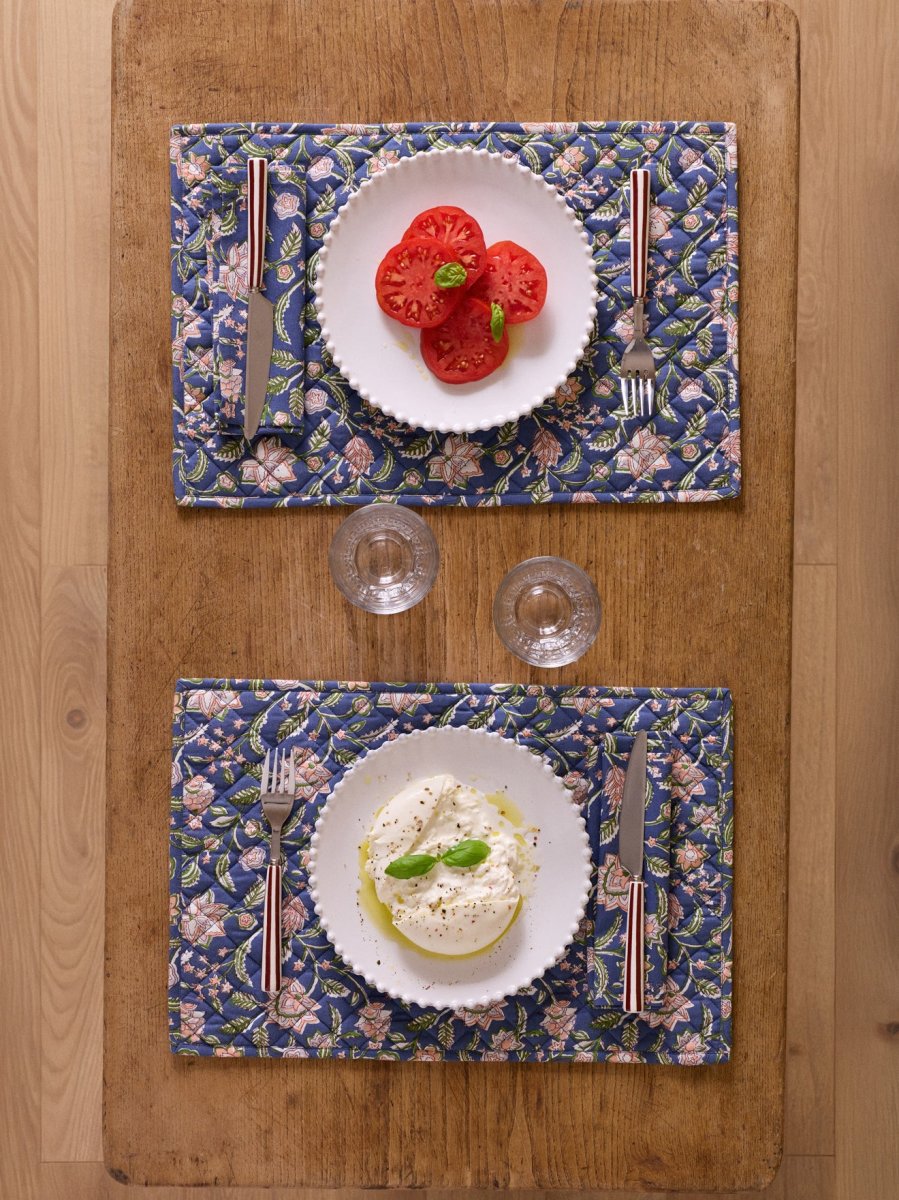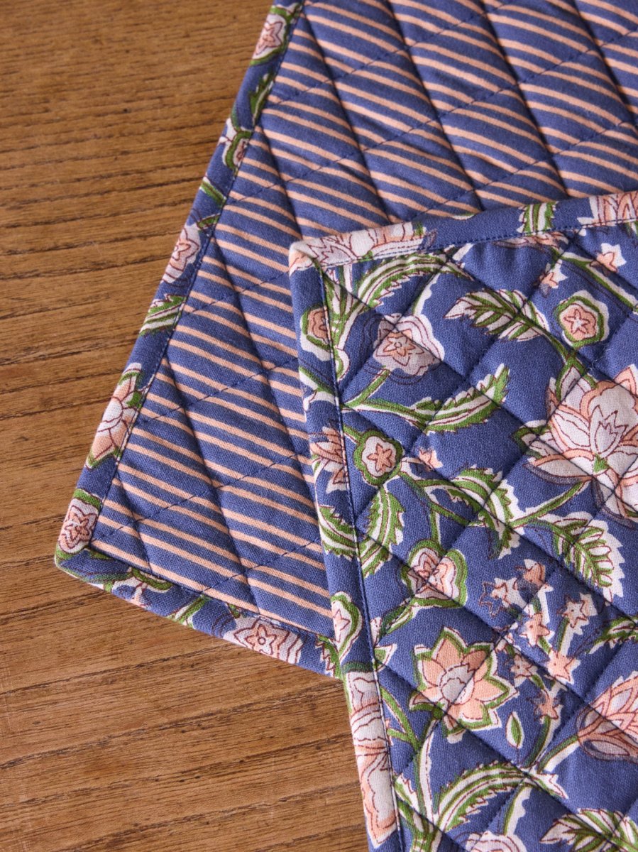 Lot de 2 sets de table en coton réversibles et matelassés : fleuri indien d’un côté et rayures de l’autre. Authentique et raffiné, l’imprimé fleuri Bella est un motif réalisé à la main en Inde.