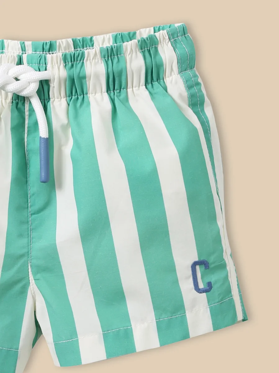 Un maillot de bain coloré à larges rayures. Taille élastiquée avec liens