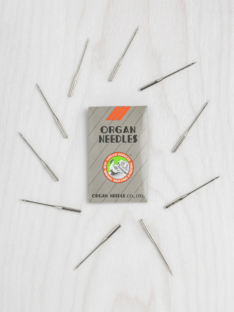 These needles from Organ are what we recommend and use in our studio. We love the exceptional quality and the fact that their packaging doesn’t contain any plastic. These needles are flat on one side. Organ needles work in most modern domestic sewing machines, sergers and embroidery machines, including Janome, Bernina, Juki, Brother, Elna, Baby Lock and Singer. Always confirm with your sewing machine manufacturer to ensure you are using a needle that will work with your machine!