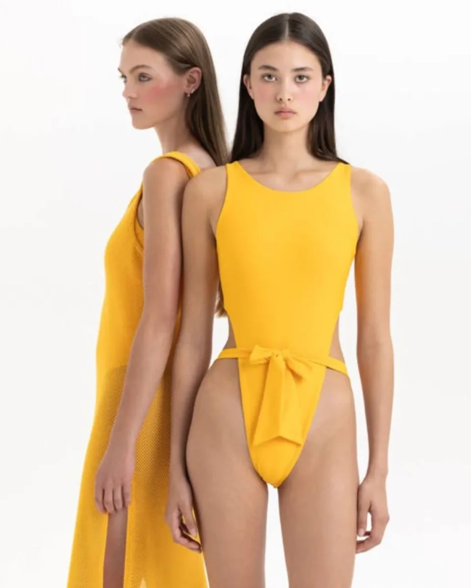 Bright, bold, and built to move, this solid mango yellow swim knit comes straight from the studio of iconic Montreal indie designer Nadya Toto. With a smooth hand, fluid drape, and generous four-way stretch with excellent recovery, it’s a sunshiney staple for all kinds of activewear and swimwear projects. Made from a high-quality nylon elastane blend, it’s fully opaque and ready for anything, from supportive sports bras and leggings to sleek swimsuits or vibrant knit dresses.