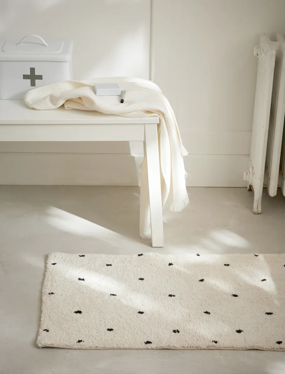 Tapis de bain en coton absorbant recouvert de pois « flashy » irréguliers.