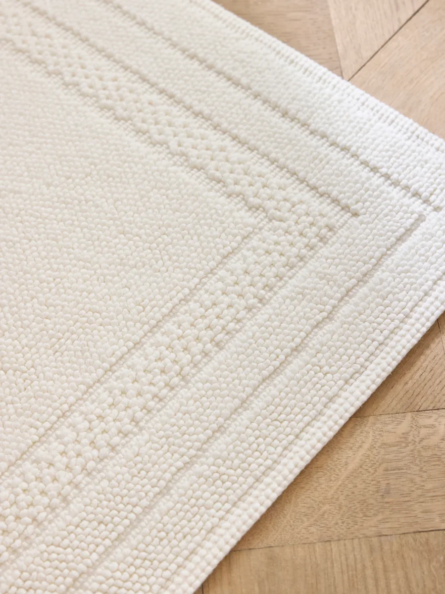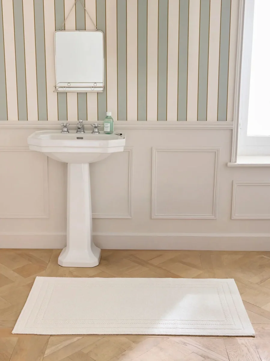 Tapis de bain en pur coton confectionné et tissé au Portugal. Ses bouclettes épaisses et moelleuses procurent un confort pour les pieds mais aussi pour les yeux.
