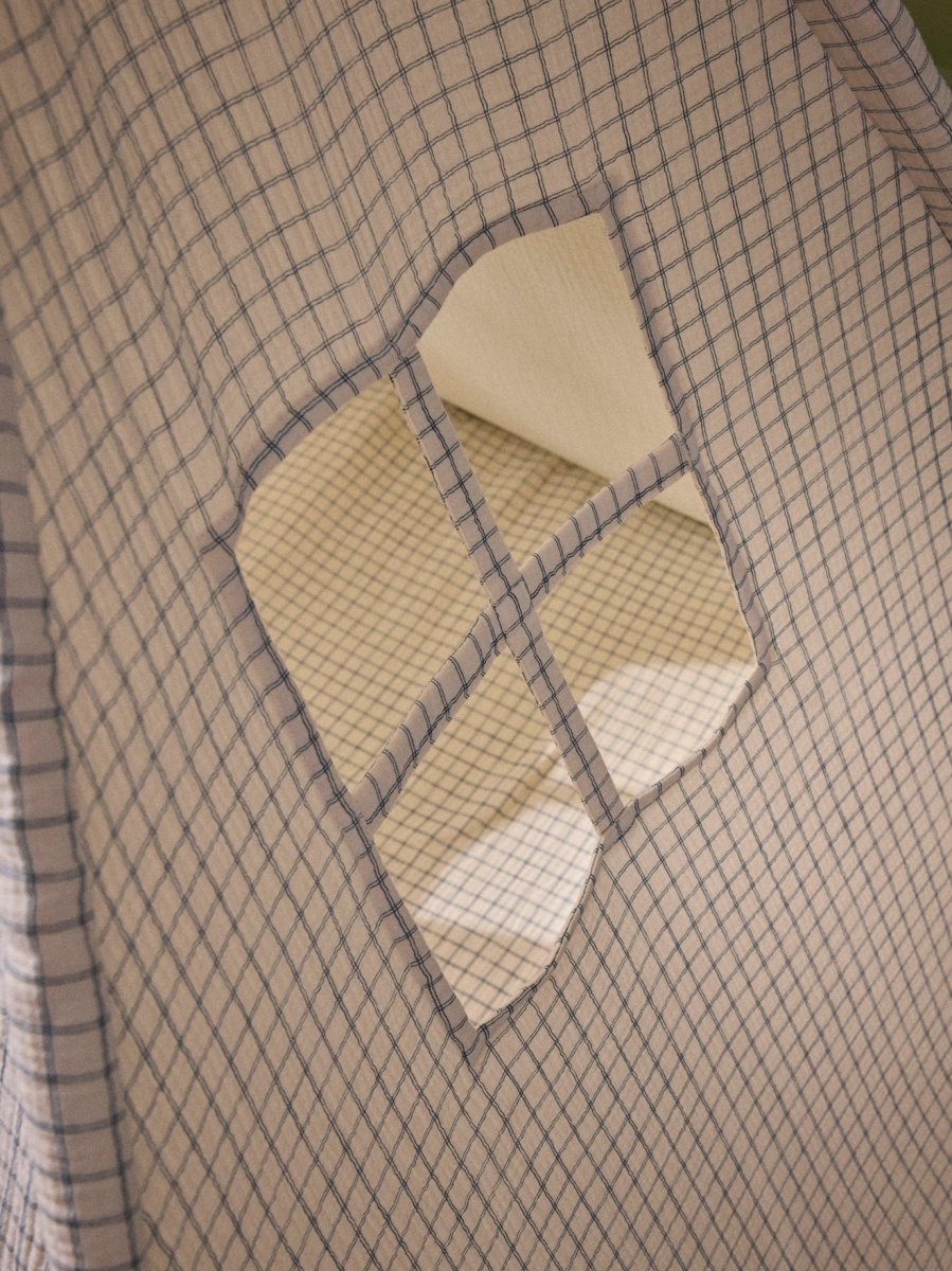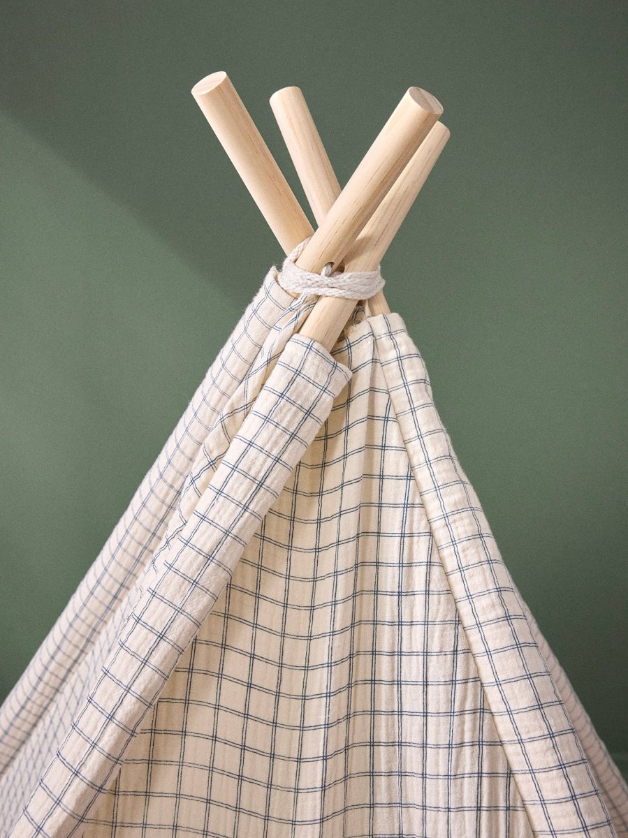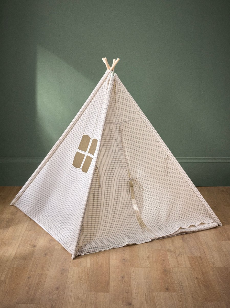 Tente d’enfant réalisée dans un esprit maisonnette, composée de 4 piquets en bois et d’une toile en gaze de coton imprimée. Petit cocon pour jouer ou se détendre confortablement grâce au matelas moelleux inclus.