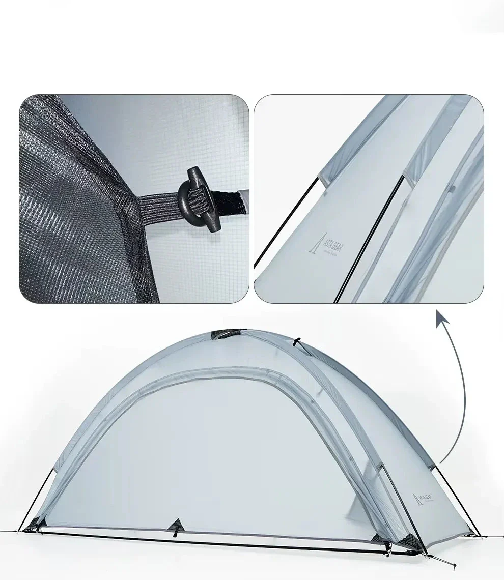 Tente randonnée 1 place Asta Gear 1 autoportante et ultralégère. Conçue pour le trek, le bivouac alpin et le cyclotourisme, cette tente dôme double paroi offre une excellente protection au vent, à la pluie et à la neige légère tout en restant compacte dans le sac.