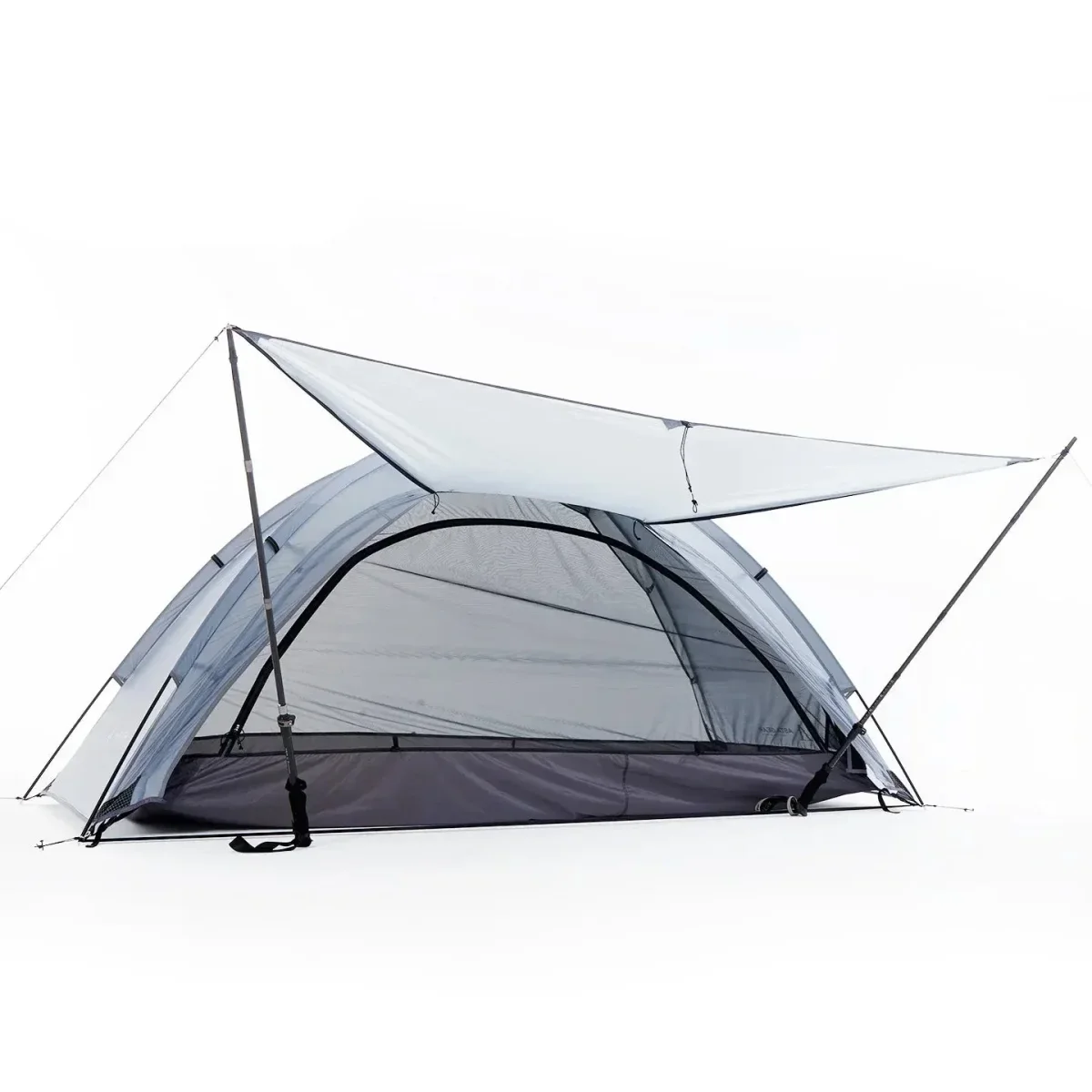 - Architecture dôme autoportante : deux arceaux croisés en aluminium 8,5 mm assurent une structure stable qui tient seule même avant la pose des sardines, pratique sur sol rocheux ou en neige.