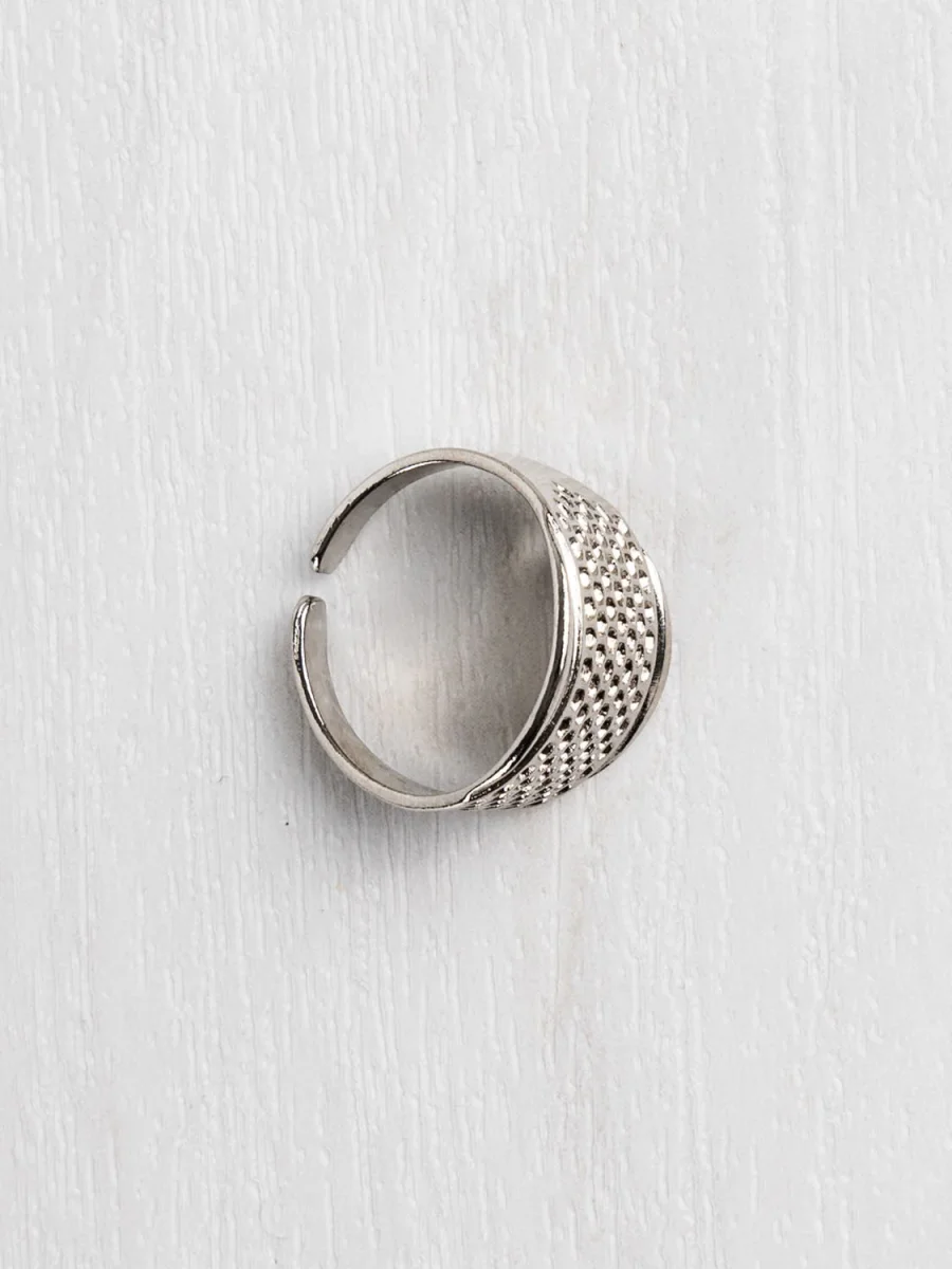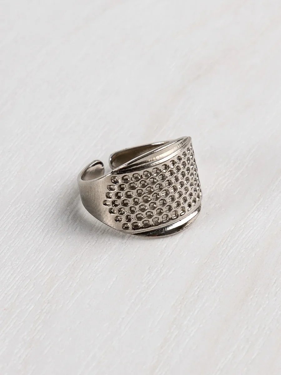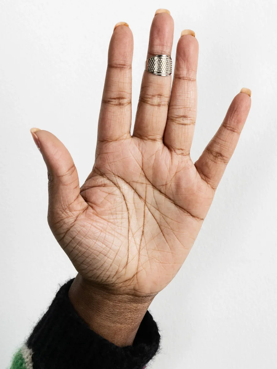 A classic thimble, ring-designed to fit any finger. Its dimpled surface provides grip while protecting you from any sharp pointy things (like needles). Comfortable enough to wear for long hours, sturdy enough to last for hundreds upon hundreds of projects.