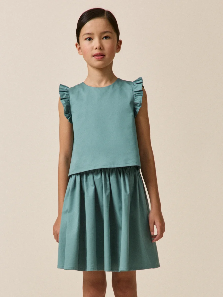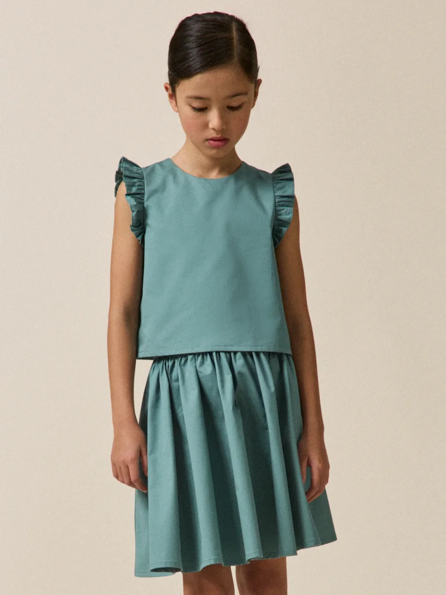 Top en satin de coton séduit par sa teinte douce et lumineuse. Sa coupe épurée est sublimée par un jeu de plis aux épaules. Goutte fermée par bouton au dos Jupe assortie sur notre site