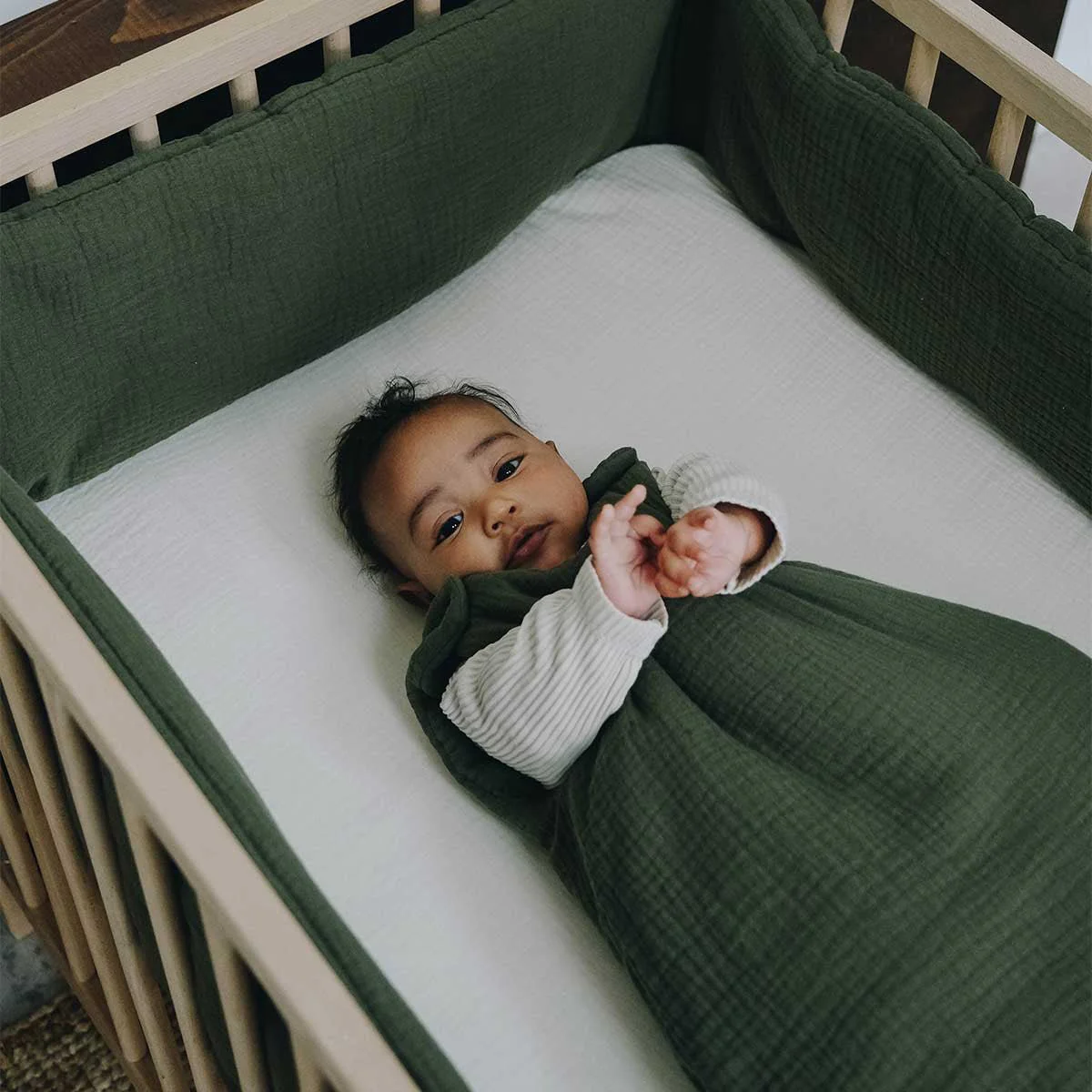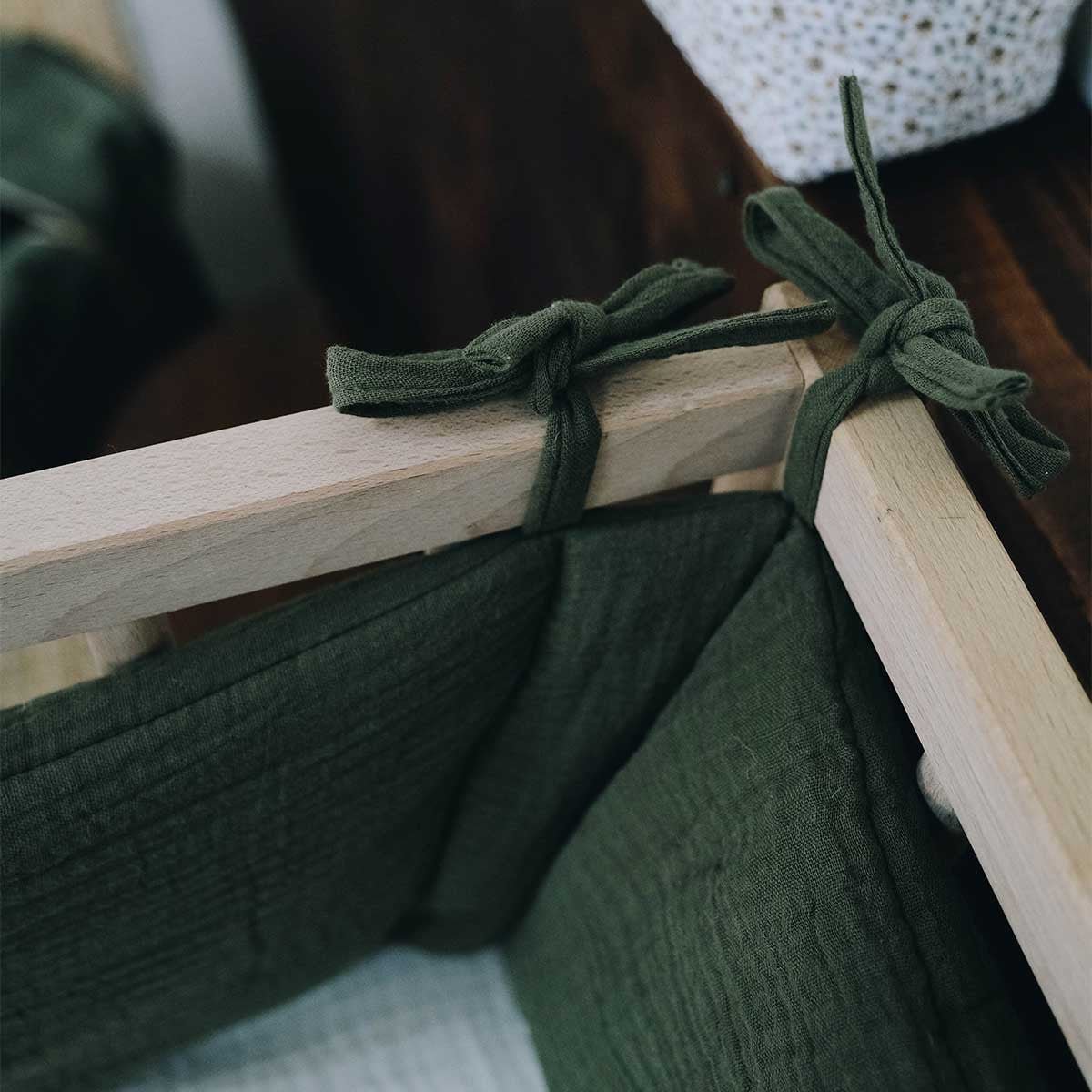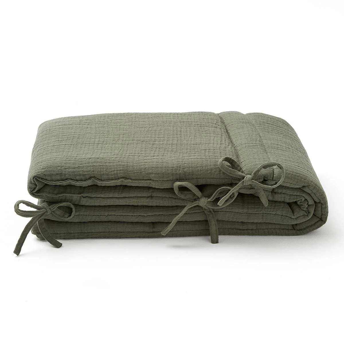 Pour un lit « cocoon », choisissez un tour de lit Cocoeko en double gaze de coton. Ce tour de lit vert Fougère ira parfaitement avec la gigoteuse avec imprimé Fleuri Fougère.
