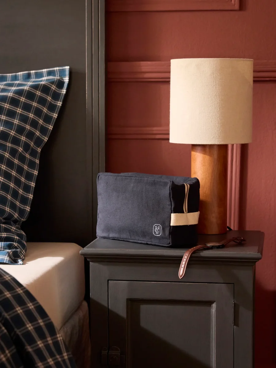 Trousse de toilette en toile de coton épaisse. 4 poches intérieures élastiquées pour un rangement optimal. Fermeture par glissière en métal. Doublure rayée coloris ocre.