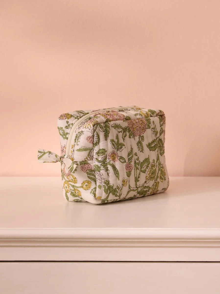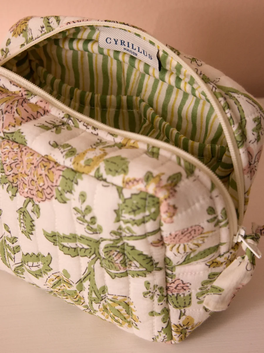 Trousse en coton matelassé proposée dans 2 formats pratiques pour y glisser vos affaires de toilette. Déclinée en 2 variantes fleuries : Sofia (vert/rose orangé) et Camélia (rose/bordeaux). Piqûres verticales pour un effet matelassé. Intérieur rayé assorti.