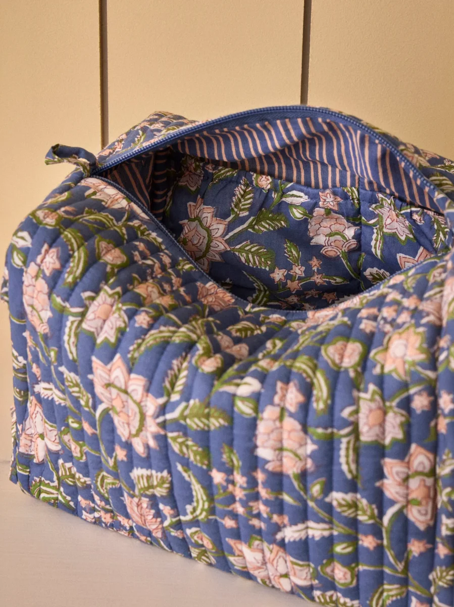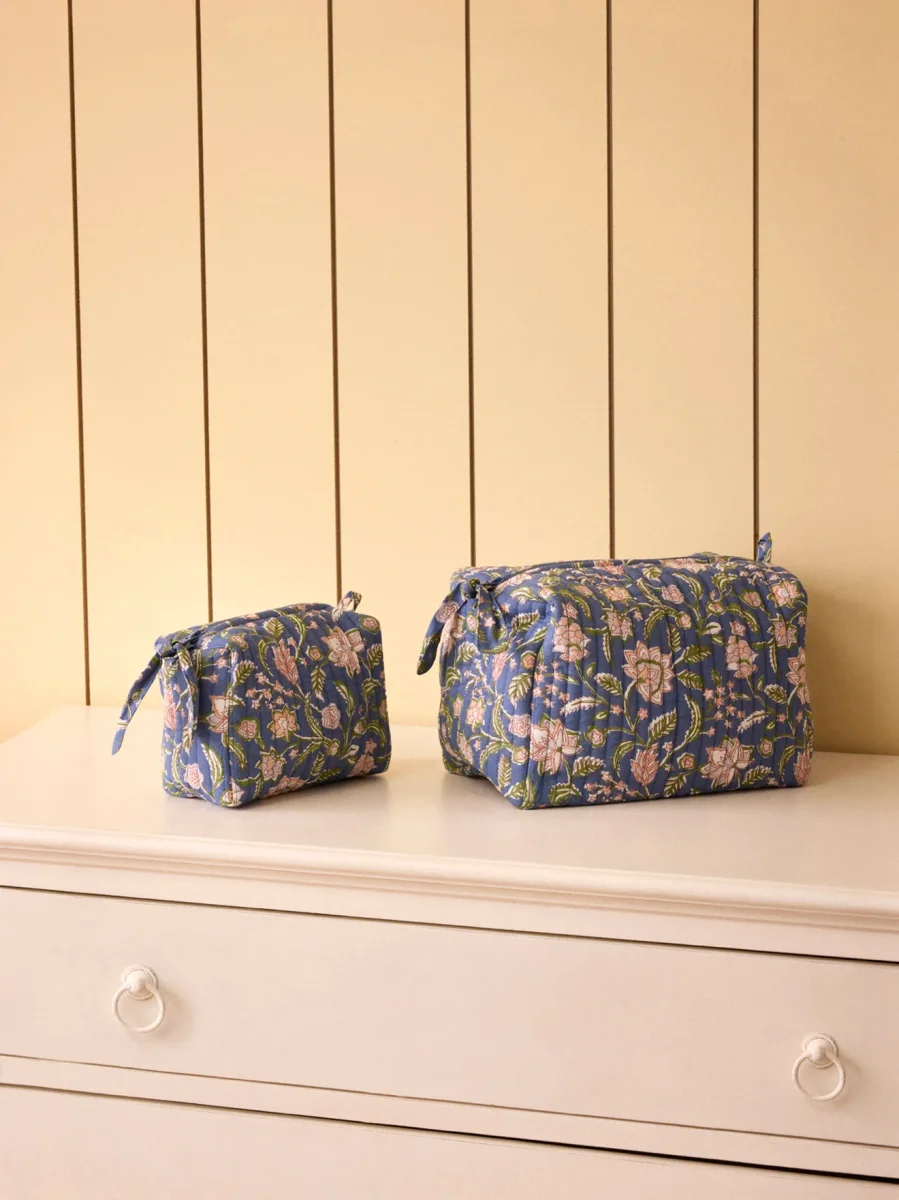 Trousse en coton matelassé proposée dans 2 formats pratiques pour y ranger vos affaires de toilette. Le charme d’un imprimé fleuri sublimé par une alliance délicate de rose, de vert et de bleu. Piqûres verticales pour un effet matelassé. Intérieur rayé assorti.
