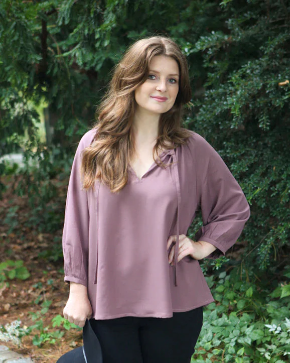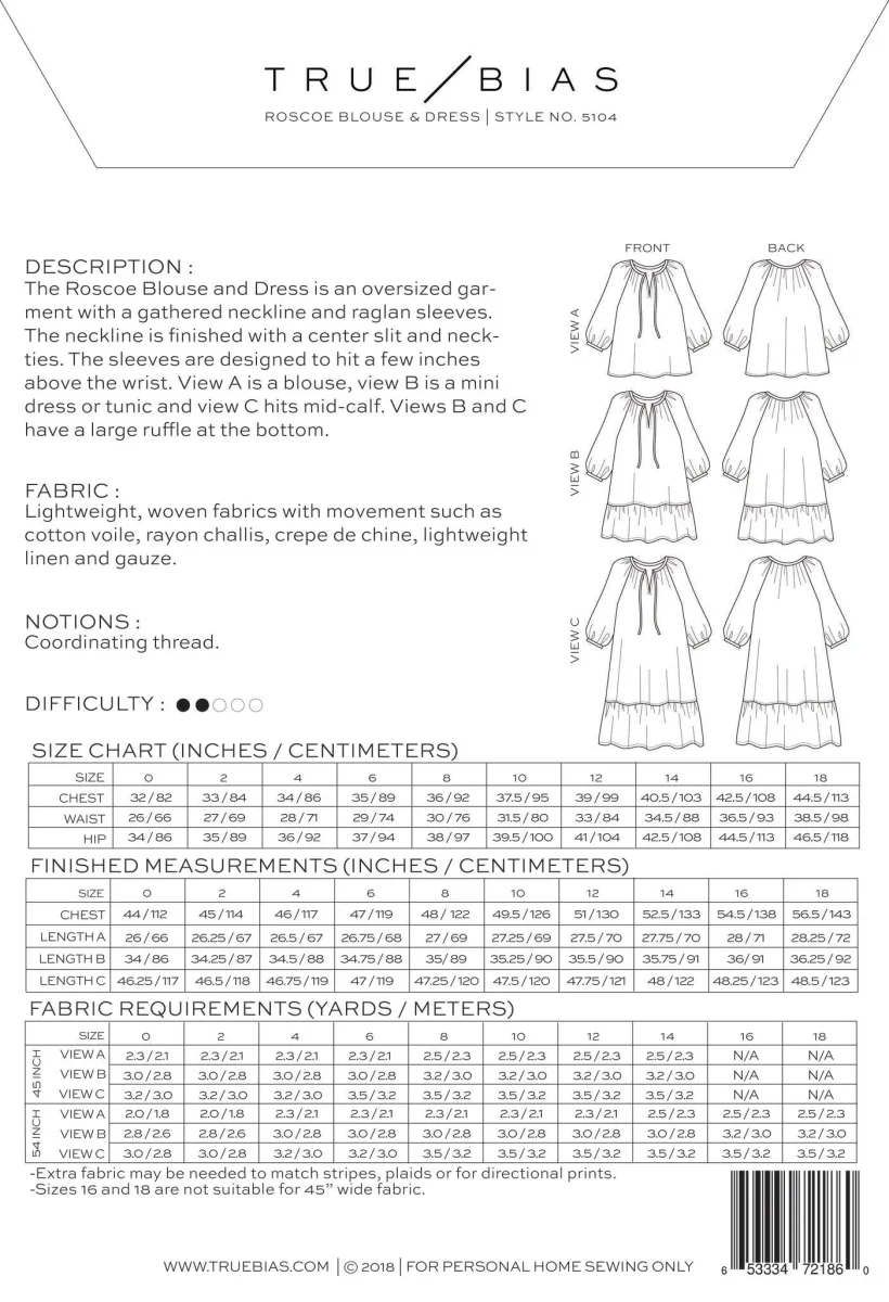 The Roscoe Blouse and Dress is an oversized garment with a gathered neckline and raglan sleeves. The front is finished with a center slit and neckties. The sleeves are designed to hit a few inches above the wrist. View A is a blouse, view B is a mini dress or tunic and view C hits mid-calf. Views B and C have a large ruffle at the bottom.