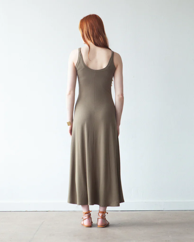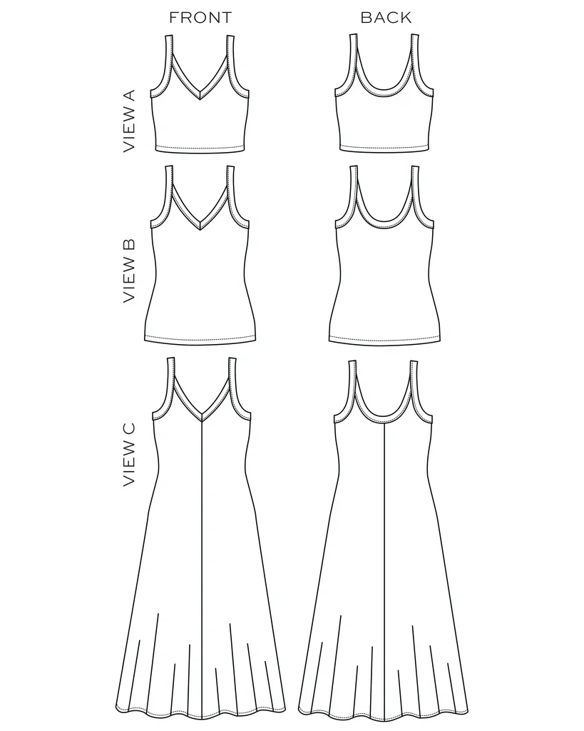 The Zoey pattern is a fitted knit tank top and dress. All views have a soft front V and low scooped back neckline. Armholes and necklines are finished with 5/8” wide bands. Views A and B are tank tops where View A has a cropped length hitting around the natural waist and View B ends around the hipline. View C is a fit and flare tank dress with a center front and back seam for extra shaping and the hem ending a few inches above the ankle. The main garment and bands can all be sewn up in the same fabric or use a contrasting fabric for the bands for added interest.
