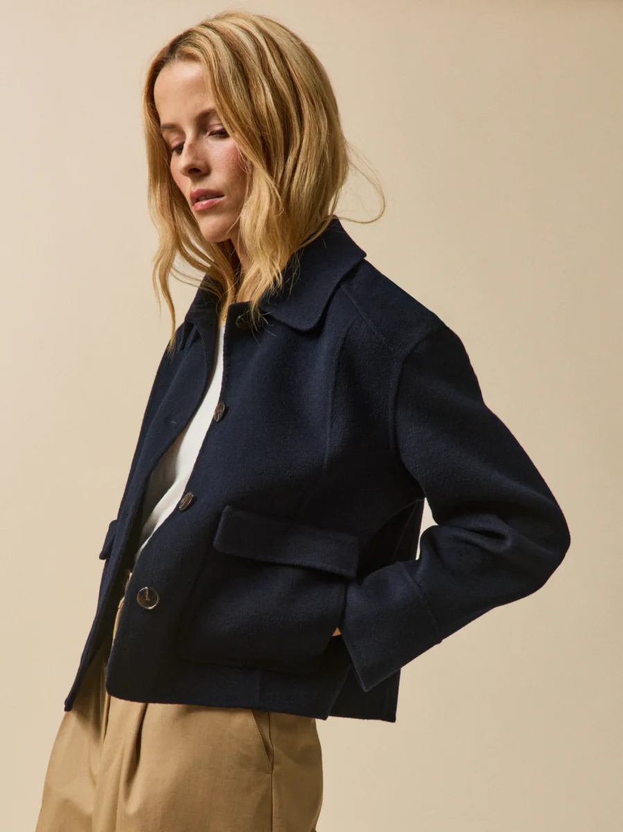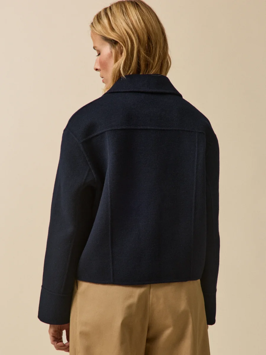 Ligne épurée sur lainage double face chic et chaleureux. Tout en souplesse, la veste se plie aux exigences d’un style urbain contemporain. À l’aise à l’intérieur comme à l’extérieur, elle signe un look ultra confort, toujours impeccable.