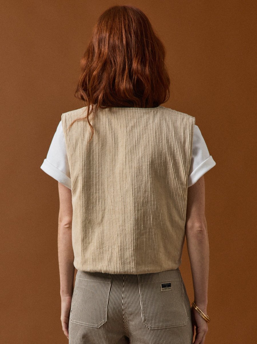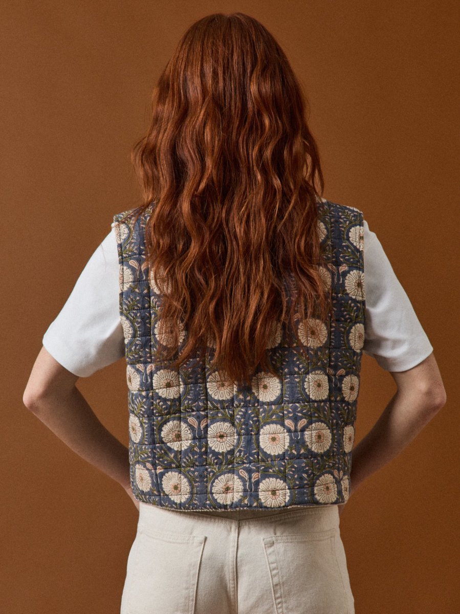 Veste ou gilet de demi-saison, sans manches et réversible. Tantôt fleurie et matelassée, tantôt unie en gros velours côtelé. Idéale pour réchauffer une tenue ou lui donner du style.