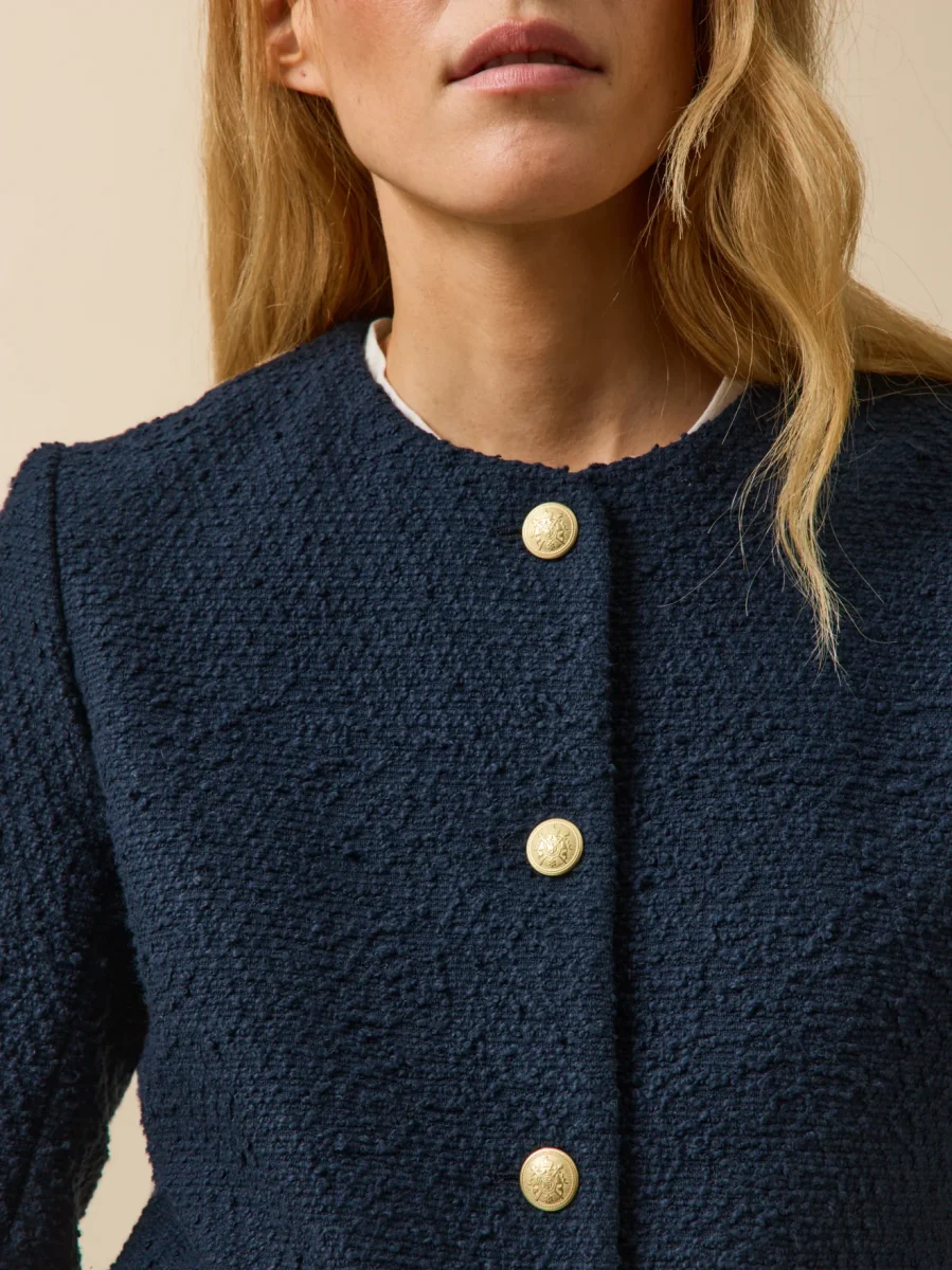 Avec son volume boîte, son tweed de qualité italienne et ses boutons dorés, la petite veste en tweed plonge au coeur de la tendance cool chic. Un essentiel du dressing urbain quotidien, à porter aussi bien dehors qu’en intérieur. Confection Europe.