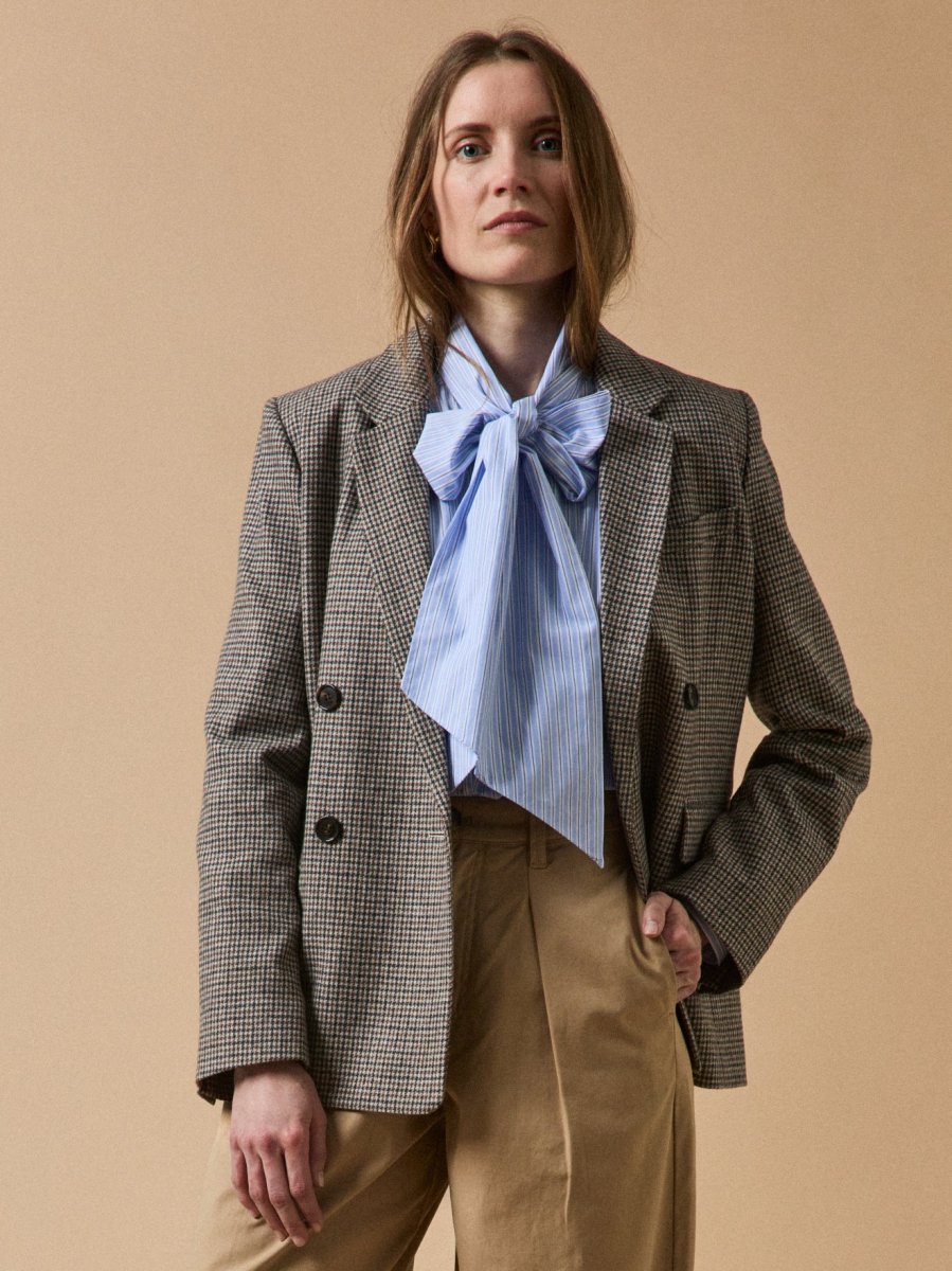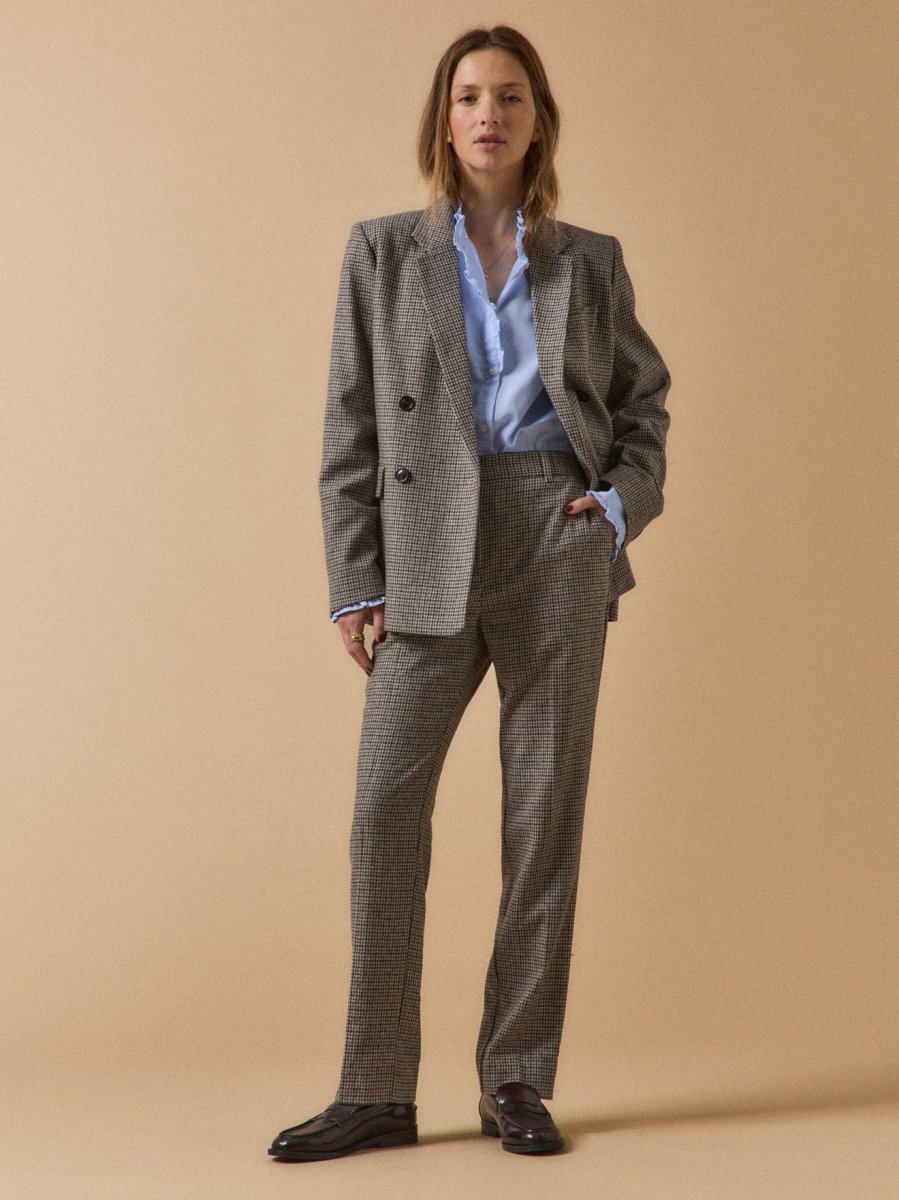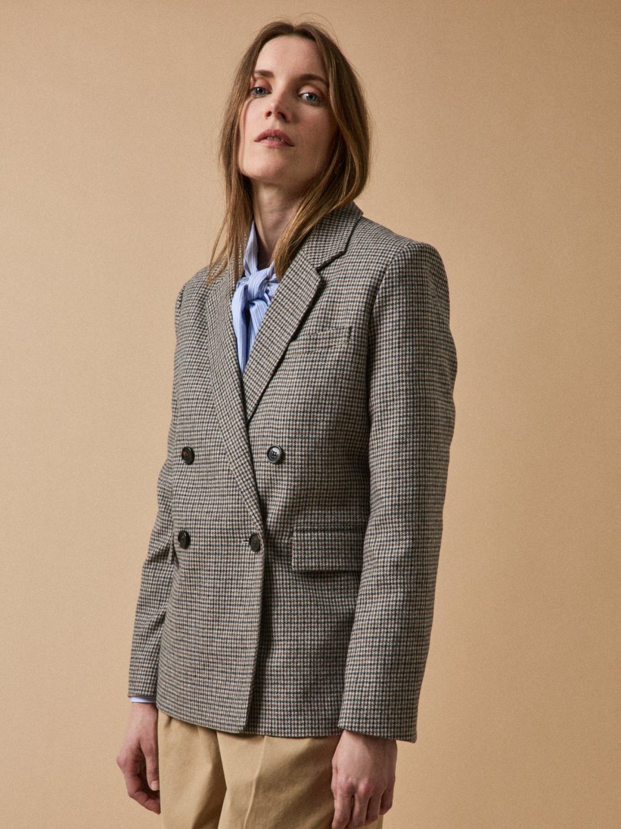 Lainage carreaux de qualité italienne, tonalités modernes et double boutonnage. Jolie proposition de style, la veste s’approprie une allure plus actuelle. Elle signe un style impeccable avec un jean, mais se porte aussi en mode tailleur. Confection Europe.
