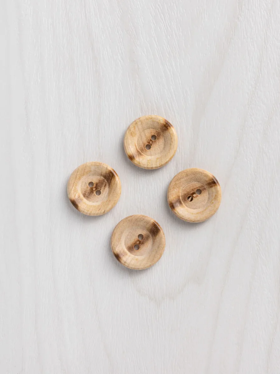These simple, rustic wooden buttons add a touch of organic warmth to any make. With a burnt stripe to add visual interest, they’re a simple way to finish any garment.These buttons measure 23mm (7/8″) and come in a pack of 4.100% wood, made in the USA.