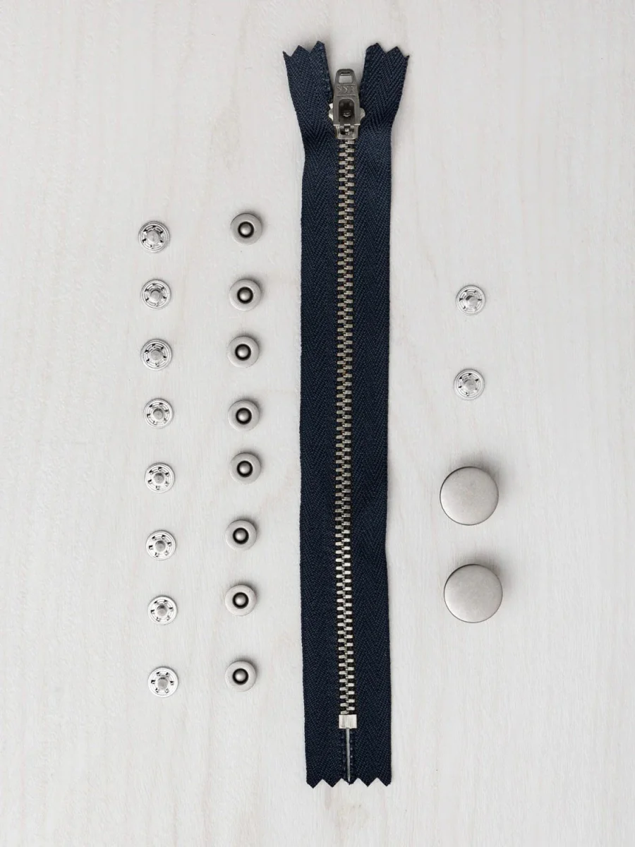 This notion kit for zipper-fly jeans includes: